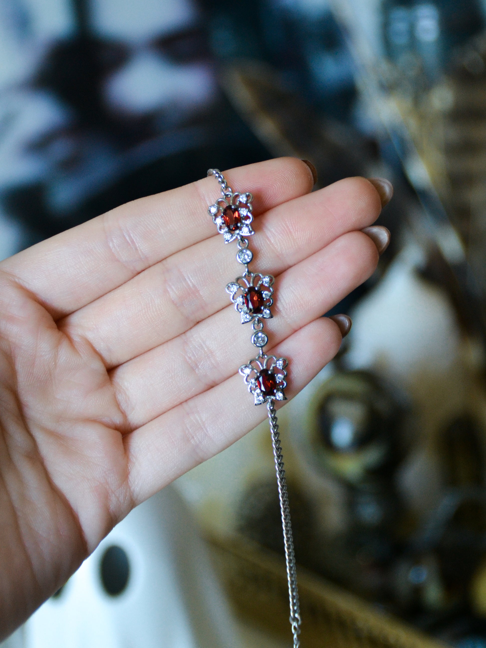 Bracciale con farfalle in granato e zirconcini, in rame placcato, regolabile con chiusura a moschettone.
