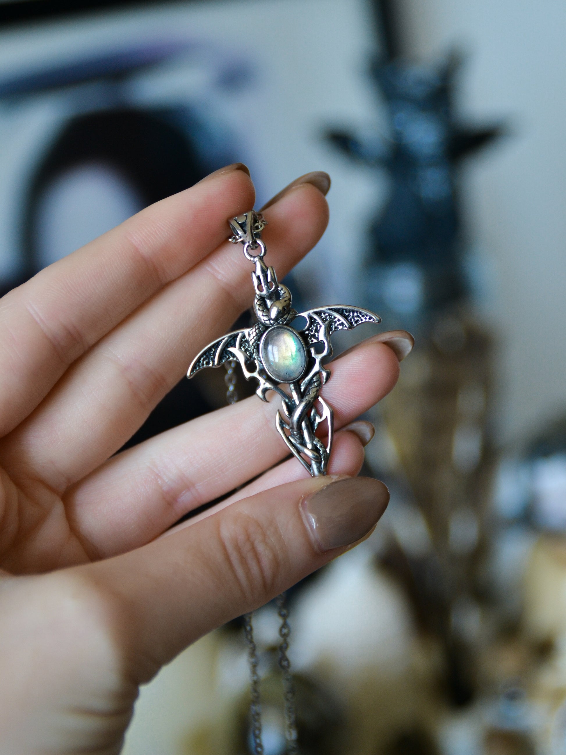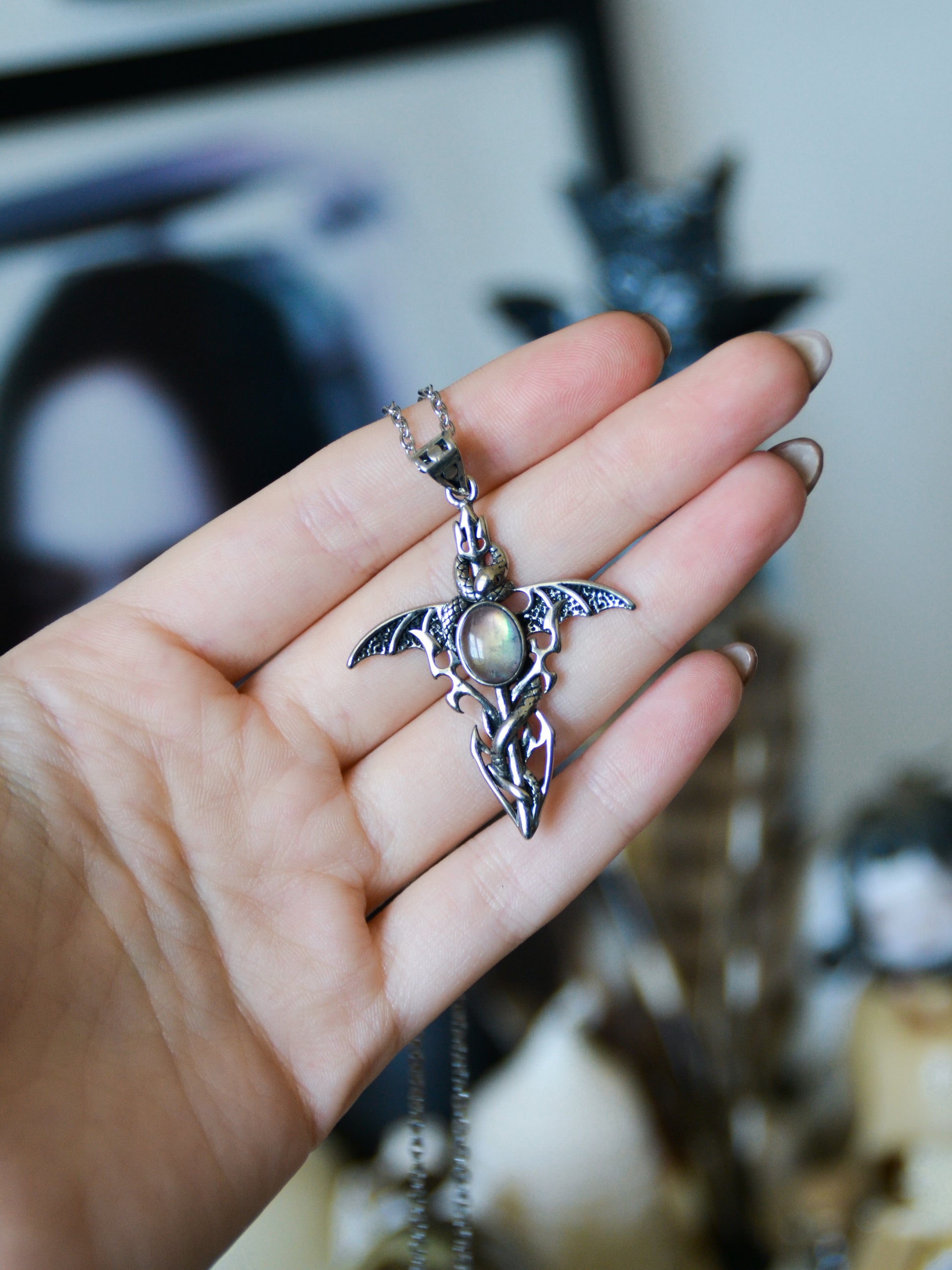 Ciondolo alato in rame placcato con labradorite. Catenina in acciaio inox inclusa.