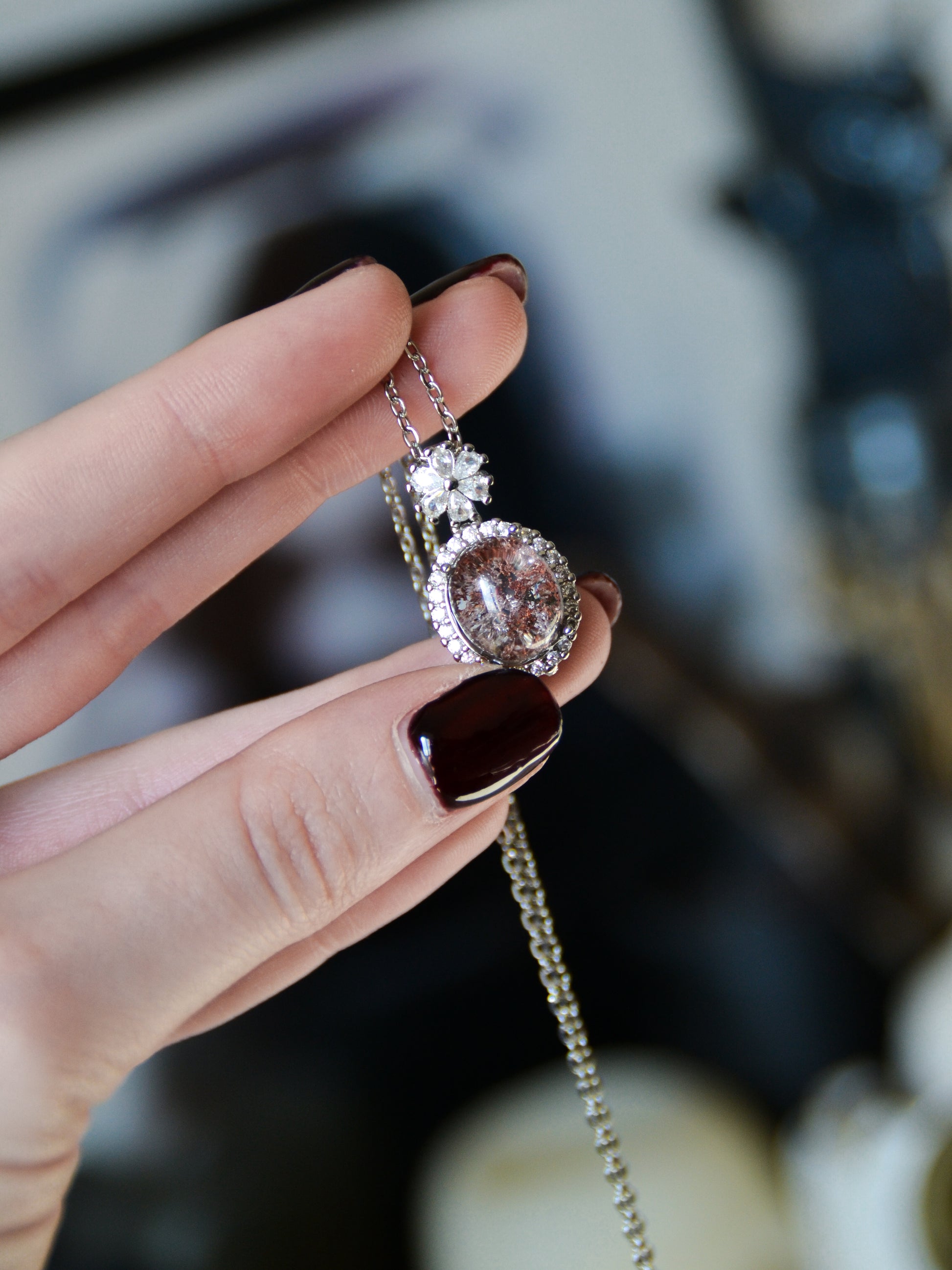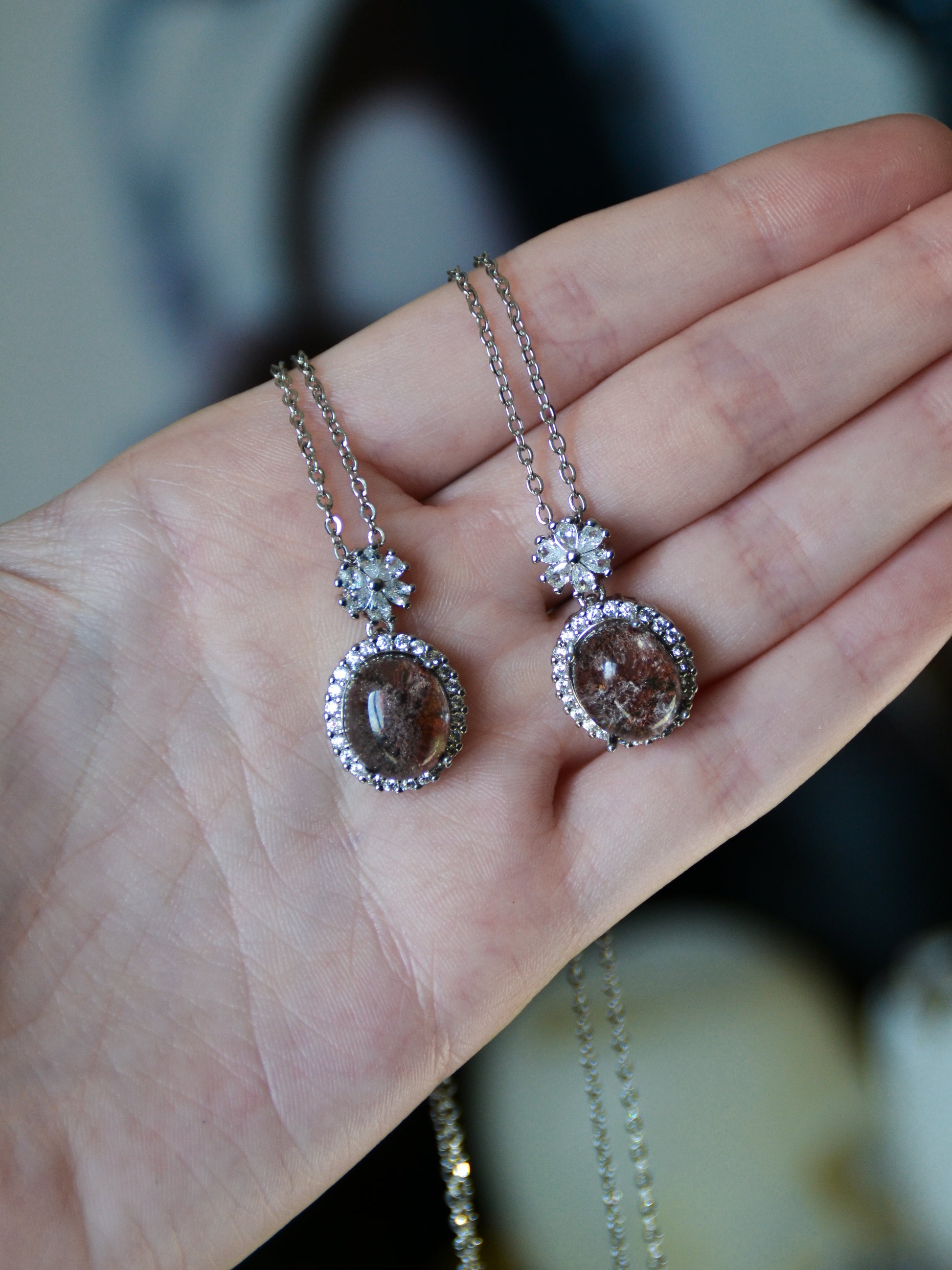 Ciondolo in rame placcato in garden quartz o lodolite, con catenina in acciaio inox inclusa.